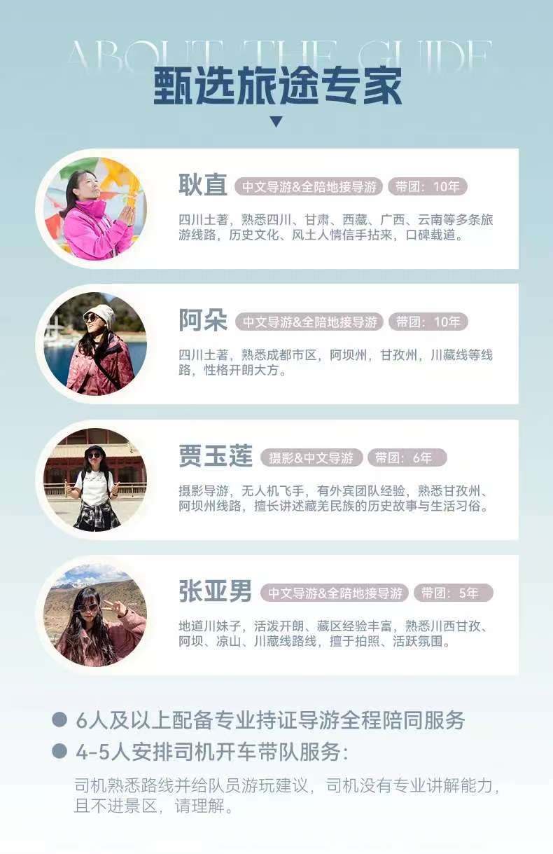 4、向导服务:6人及以上配备专业持证导游全程陪同服务;4-5人安排司机开车带队服务,司机熟悉路线并给队员游玩建议,司机没有专业讲解能力,且不进景区,请理解。