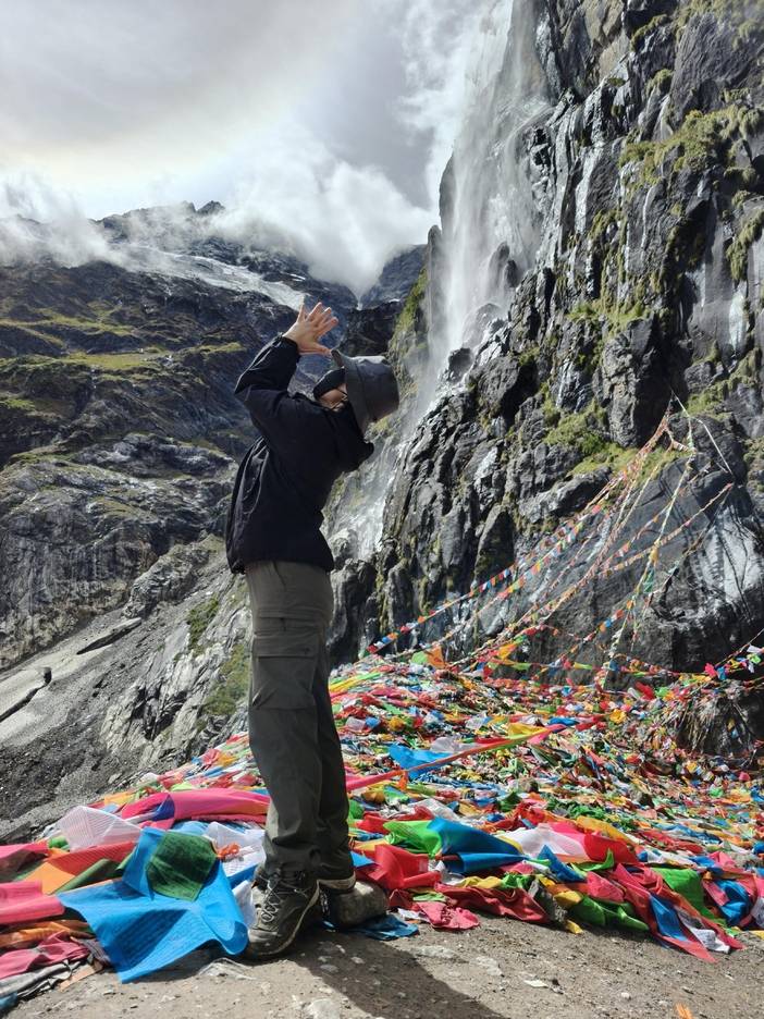 今日开启雨崩神瀑徒步,早餐后从客栈出发,看沿途蓝天白云青山碧水,穿过高山牧场和原始森林,沿着小路往上,就能看到从梅里雪山上的飞泄而下的冰山融水形成的神瀑。这里可以看神女峰和五冠峰的全貌,同时这里也是朝圣者接受洗礼的地方,只有接受过神水的洗礼,身体和心灵都得到净化,整个朝圣之旅才算是完整,游玩后我们原路返回雨崩村客栈休息。