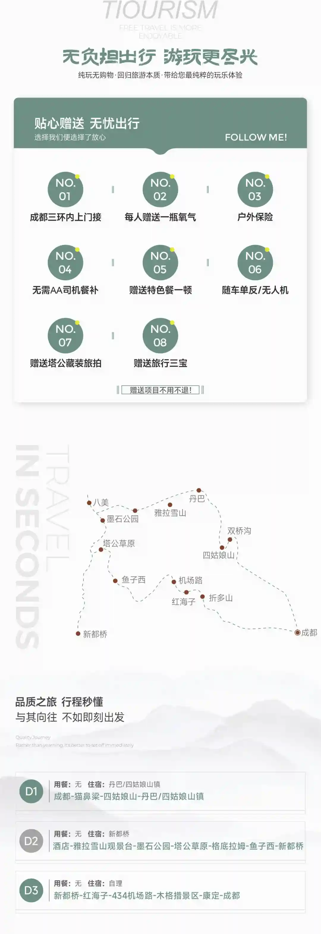 2 如434公路堵车或者封路,则走折多山,取消红海子和机场路景点,增加折多山垭口景点打卡; 【tips】温馨提示: 如遇节假日或交通管制等特殊情况,回到成都的时间较晚,建议回程尽量安排次日航班和火车!