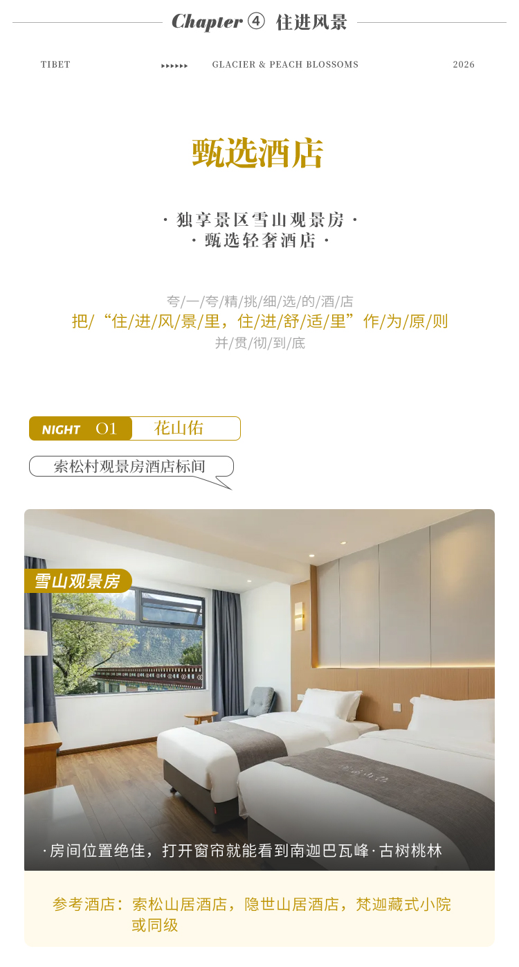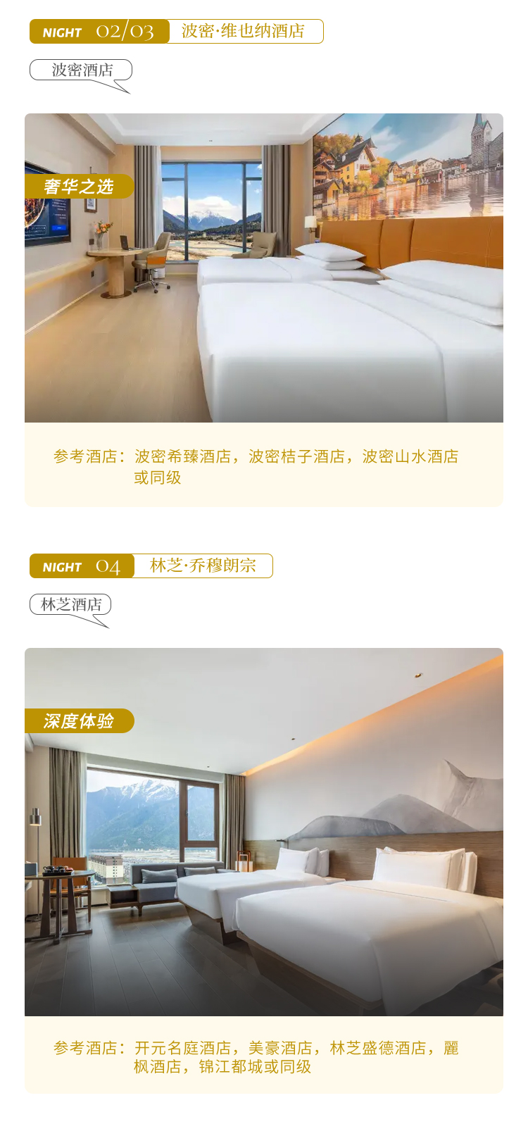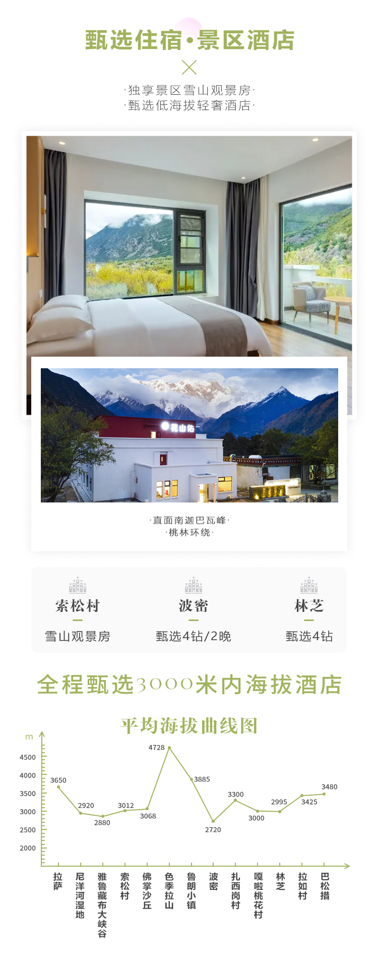 【品质住宿】全程甄选低海拔、大峡谷景区尊享雪山观景房、波密2晚4钻连住、林芝甄选4钻酒店,保障出行品质;