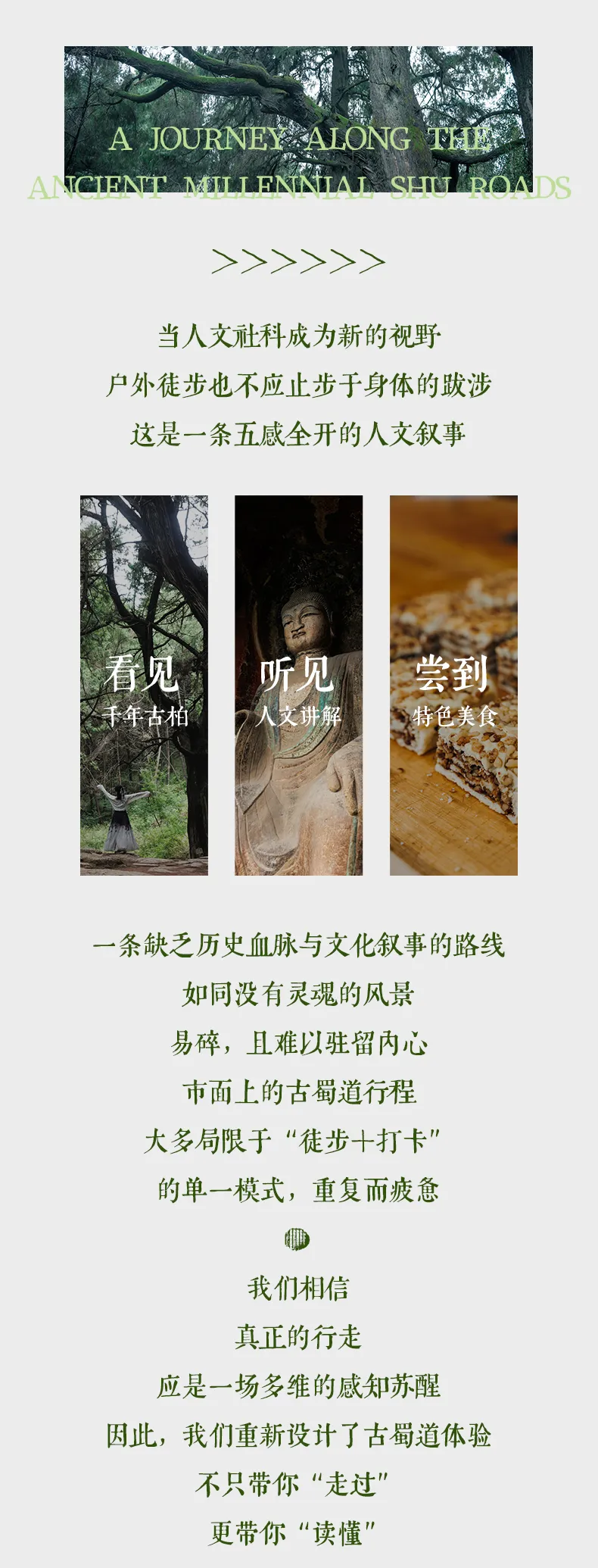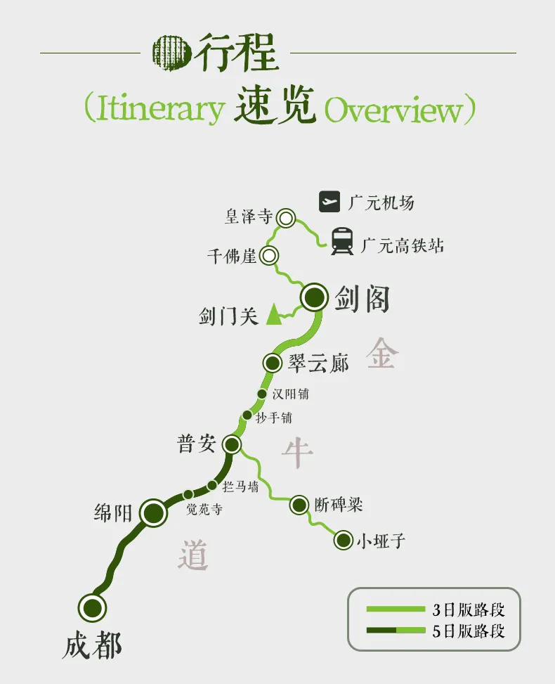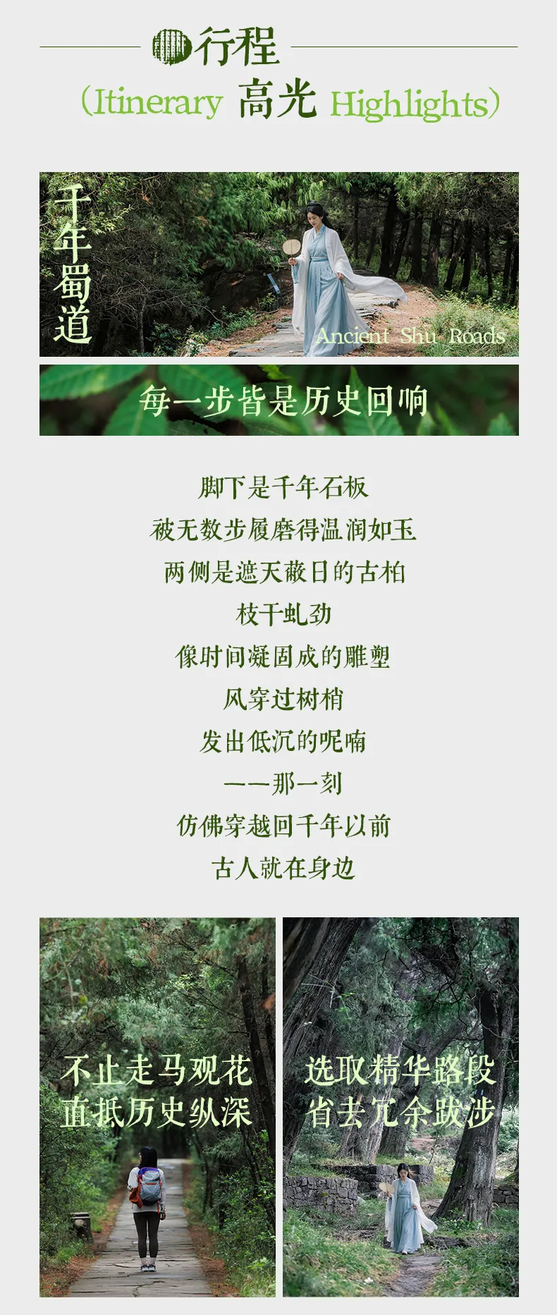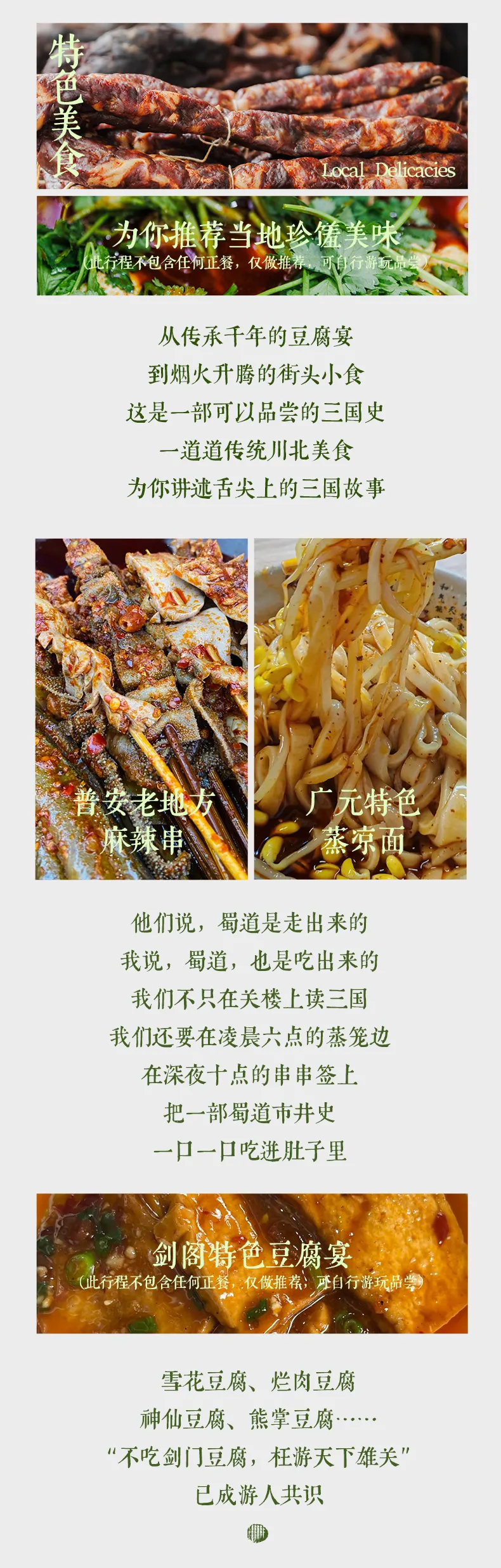 我们在翠云廊游玩约 1 小时,之后前往剑阁县城入住。晚上可以品尝当地招牌特色剑门豆腐宴,也可以体验剑阁温泉,泡去一日徒步的疲惫,舒适又惬意。