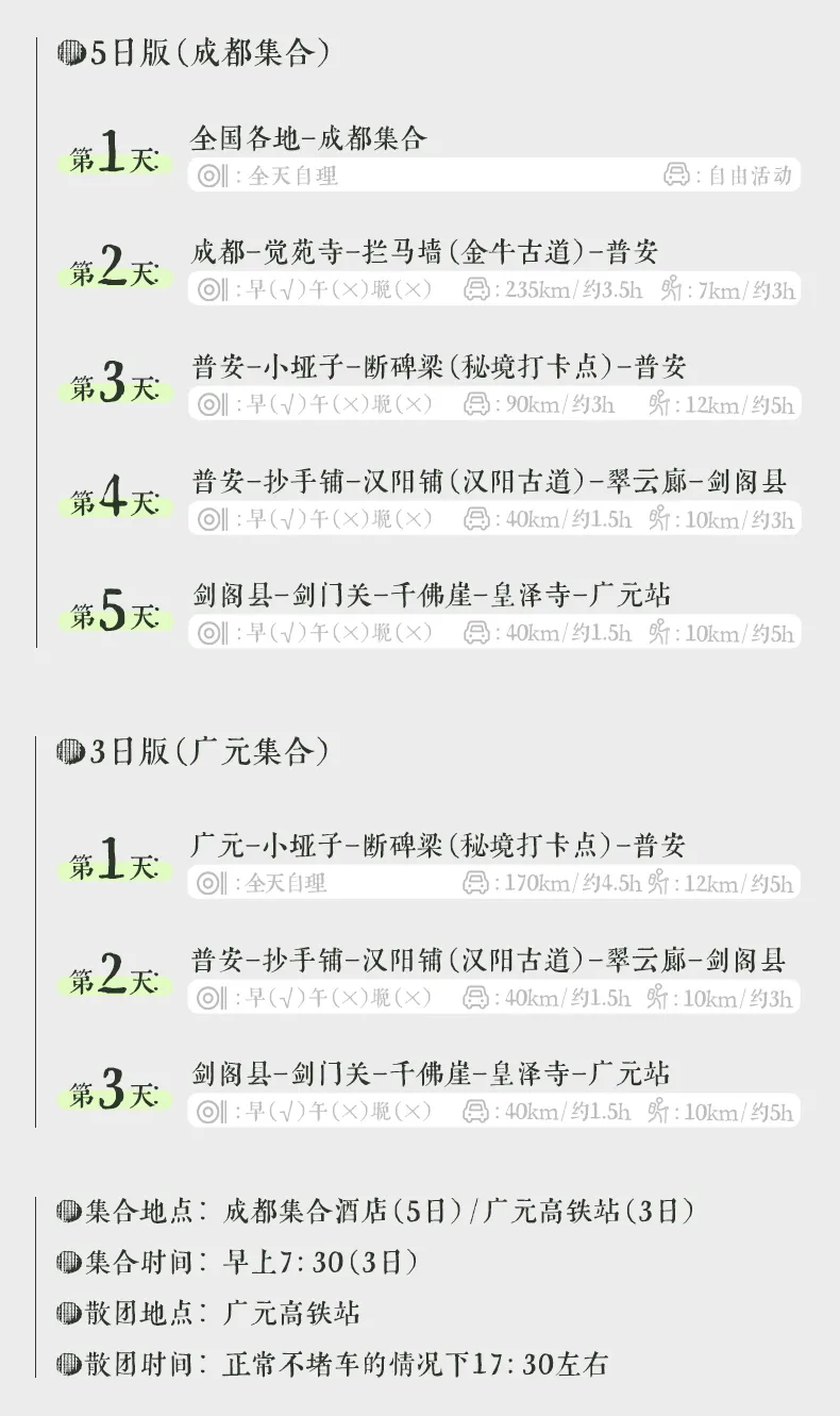4人成行,6人上导游,30人满团 常规排期 成都集合版 2026年03月01日-06月30日 每周三发团 2026年07月01日-10月31日 每周三、周六发团 2026年11月01日-次年02月28日 每周三发团 以上活动价格(节假日除外):1980元/人 儿童价:1580元/人(不占床)(单房差:480元) 广元集合版 2026年03月01日-06月30日 每周五发团, 2026年07月01日-10月31日 每周五、周一发团 2026年11月01日-次年02月28日 每周五发团 以上活动价格(节假日除外):1580元/人 儿童价:1280元/人(不占床)(单房差:280元) 节假日排期 成都集合版 2026年04月01日-04月05日(清明节) 2026年04月05日-04月09日(清明节) 2026年04月30日-05月04日(劳动节) 2026年05月01日-05月05日(劳动节) 2026年06月17日-06月21日(端午节) 2026年09月23日-09月27日(中秋节) 2026年09月30日-10月04日(国庆节) 2026年10月01日-10月05日(国庆节) 2026年10月02日-10月06日(国庆节) 2027年01月01日-01月05日(元旦节) 以上活动价格:2480元/人 儿童价:1880元/人(不占床)(单房差:680元) 广元集合版 2026年04月03日-04月05日(清明节) 2026年04月07日-04月09日(清明节) 2026年05月02日-05月04日(劳动节) 2026年05月03日-05月05日(劳动节) 2026年06月19日-06月21日(端午节) 2026年09月25日-09月27日(中秋节) 2026年10月02日-10月04日(国庆节) 2026年10月03日-10月05日(国庆节) 2026年10月04日-10月06日(国庆节) 2027年01月03日-01月05日(元旦节) 以上活动价格:2080元/人 儿童价:1680元/人(不占床)(单房差:480元) |