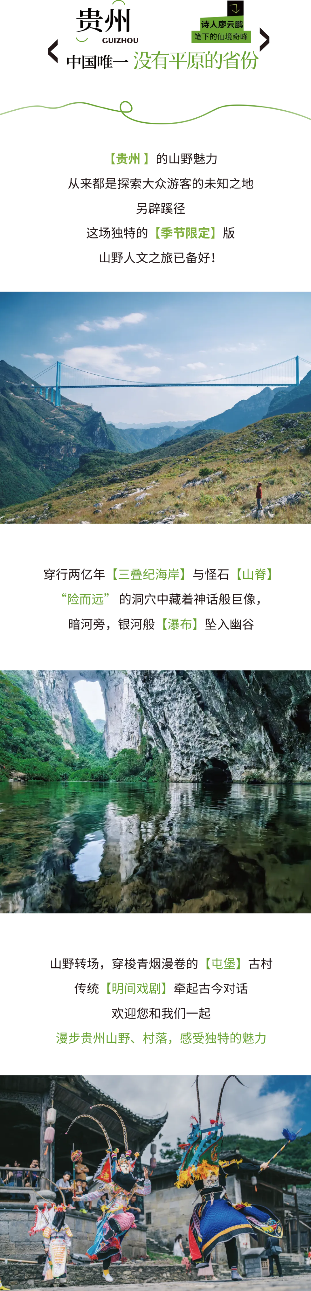 ①本日行程根据出行季节或天气情况自动调整,确保最佳体验。A线:关岭冰臼(10月-次年4月)/B线:花江峡谷(5月-9月)(注:如关岭冰臼涨水或其他因素不能走时则改走花江峡谷)