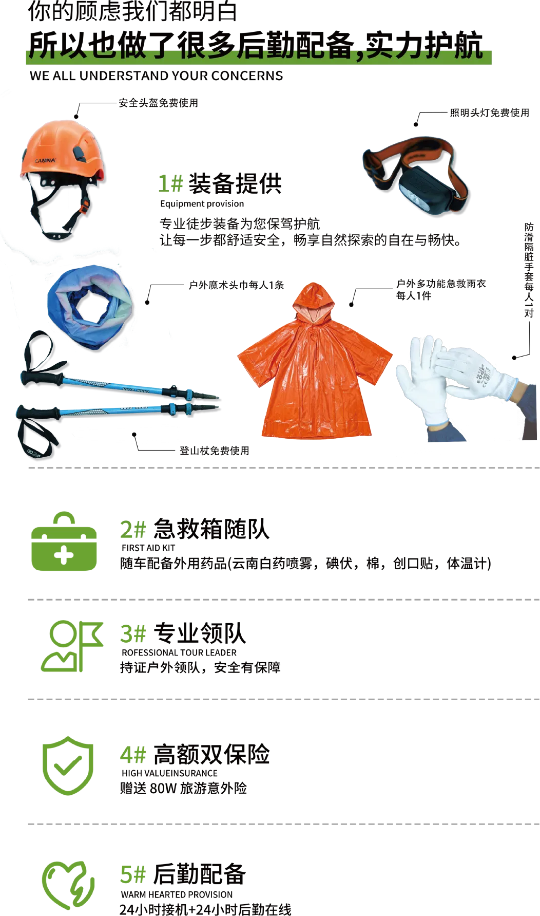 ➃ 活动提供装备中说明的:头盔/头灯/登山杖各一件免费租借(用后回收,如需要双杖请提前告知),赠送一次性雨衣/头巾/手套(不回收)