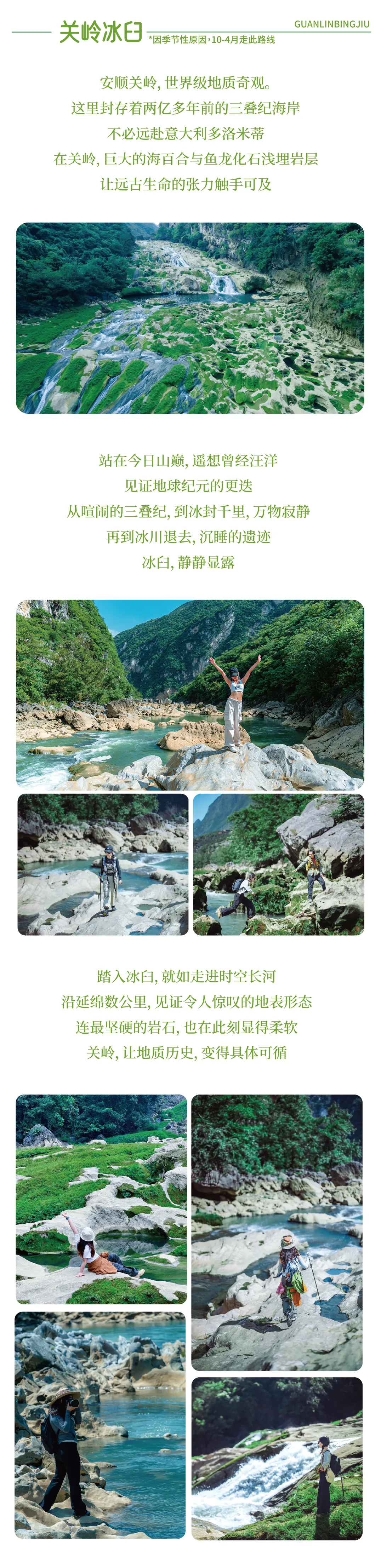 ②关岭冰臼河谷徒步约7公里,预计耗时4-5小时,累计爬升约200米,下降约150米;花江峡谷山脊徒步约9公里,预计耗时4-5小时,累计爬升约300米,下降约200米。