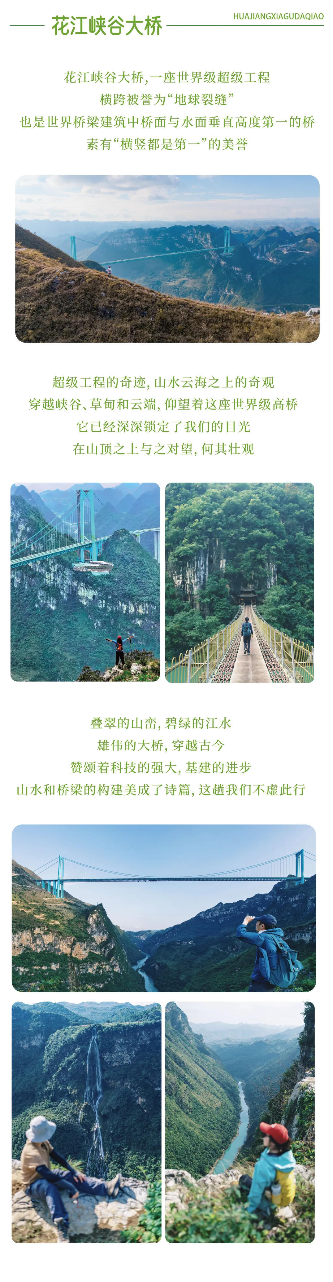 -花江峡谷:在壮丽的北盘江大峡谷中徒步,从多个独特视角仰望被誉为“世界第一高桥”的花江大桥,感受人类工程与自然造物的双重震撼。