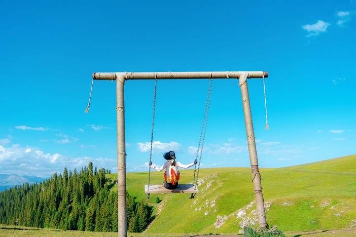 今天将徒步前往悬崖网红秋千打卡,这是喀拉峻的标志性打卡点。脚下是深达数百米的库尔代大峡谷,远处天山雪山群—喀班巴依峰等连绵横亘,雪顶在云天下泛着冷光。纯实木秋千位于悬崖边,四周是五花草甸,黄、紫、白野花簇拥,风过时草浪与峡谷云雾相呼应,像悬在空中的花海……从众神之门出发,沿着山脊木栈道缓行,左侧是库尔代峡谷的纵深绿意,雪岭云杉沿谷壁墨绿成带,右侧是波浪状的人体草原。坡地开满报春花、金莲花、银莲花,成片铺到雪山脚下,空气里满是青草与花香。之后乘车前往恰西燕子沟河谷游玩,这里静谧原始,流水声、鸟鸣声,声声入耳。