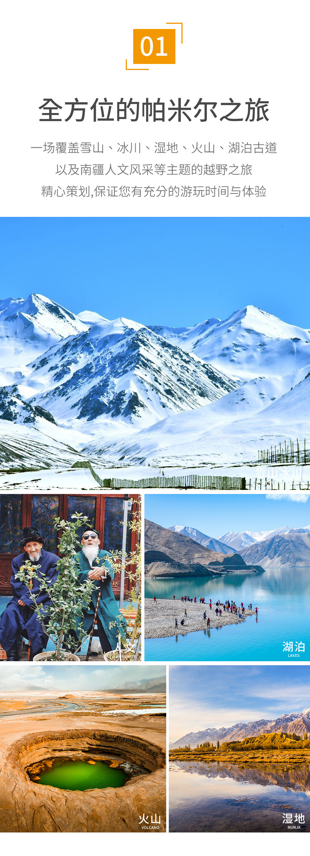 早餐后约9:30准时集合,统一前往办理边境通行证,之后正式开启帕米尔高原之旅,全程行驶著名的中巴友谊公路,这条国际公路从喀什直达巴基斯坦首都伊斯兰堡,一路雪山峡谷相伴。首先抵达奥依塔克红山野狼谷,这里是典型的红色丹霞地貌,山体赤红如焰,沟壑纵横,在阳光下色彩浓烈,可近距离漫步观赏,感受大自然的鬼斧神工(禁止攀爬陡坡)。午餐后前往木吉火山口,全名喀日铁米尔火山群,被誉为“帕米尔之眼”,柯尔克孜语意为“喷发”。1500年前的火山喷发,造就了冰与火交融的奇幻景观,景区内分布13处形态各异的火山口,相互交错、高低错落,搭配透明冰川、清澈冰蚀湖、幽深冰洞与甘甜冰川雪水,与十八罗汉雪峰遥遥相望,极具地质观赏价值。游览结束后前往白沙湖北岸,这里避开人潮拥挤,独享静谧湖景,碧蓝湖水搭配洁白沙山,四周被皑皑雪山环绕,宛如世外桃源。当晚入住白沙湖附近酒店。