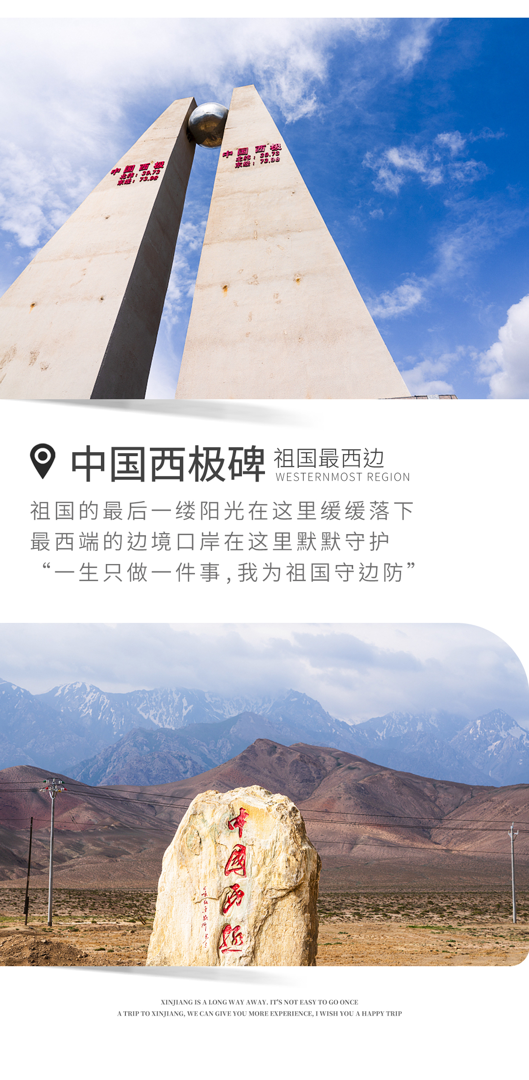 早餐后出发,首站抵达天山与昆仑山交汇处,天山呈红褐色,昆仑山呈青黑色,两山色彩分明,在此可一眼望两山、脚踏两地,感受世界级山系交汇的壮观。随后前往中国西极石碑,位于吉根乡斯姆哈纳村,是祖国领土最西端,海拔约3000米,可打卡西极塔、77号界碑,这里是中国最后一缕阳光落下的地方,极具纪念意义。打卡结束后乘车返回喀什,本次壮阔帕米尔之旅圆满结束。今日返程的团友,建议预订20:00以后的航班;时间充裕的团友,可继续留在喀什深度游玩。