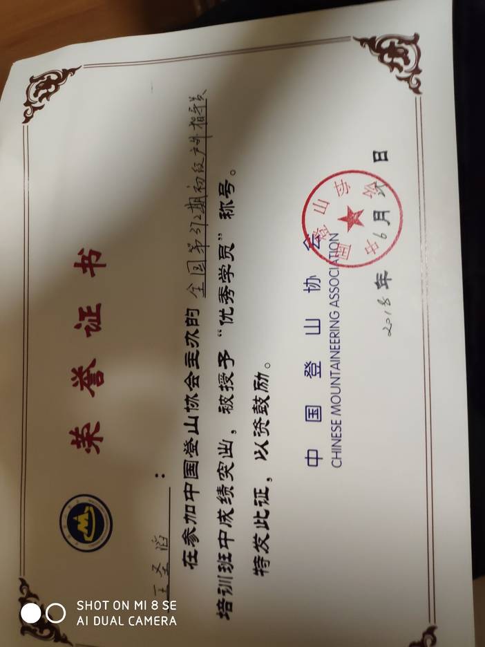 获得的专业证书有:国家一级社会体育指导员,国家级户外指导员,国家高级体育经纪人,红十字会急救员!